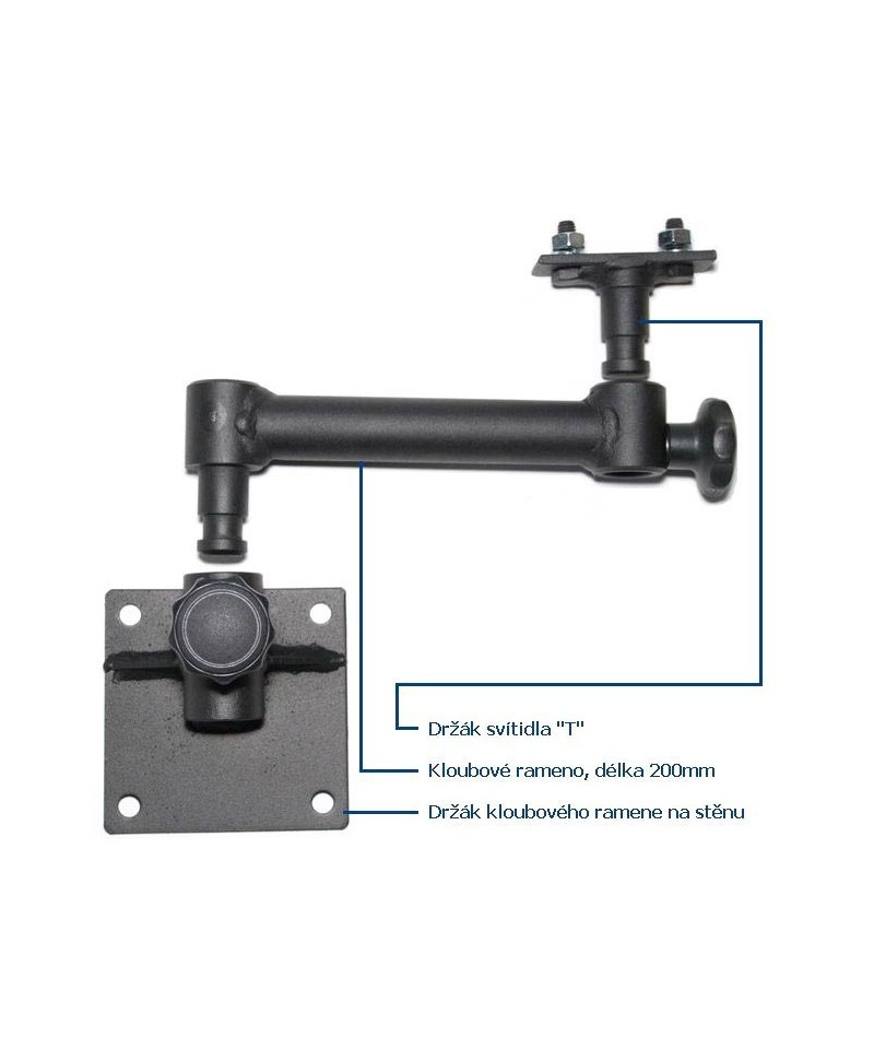 Kompletní sestava držáku svítidla k přichycení na zeď. Pro lepší variabilitu lze použít i dvě ramena.